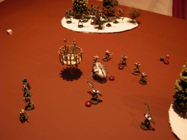 WBB: The tomb spyder was farther than the required 12 inches, but I decided to fudge it just to keep the battle going. Out of the pile of fallen necrons 9 joined the squad of necrons in the woods raising their number to 21.